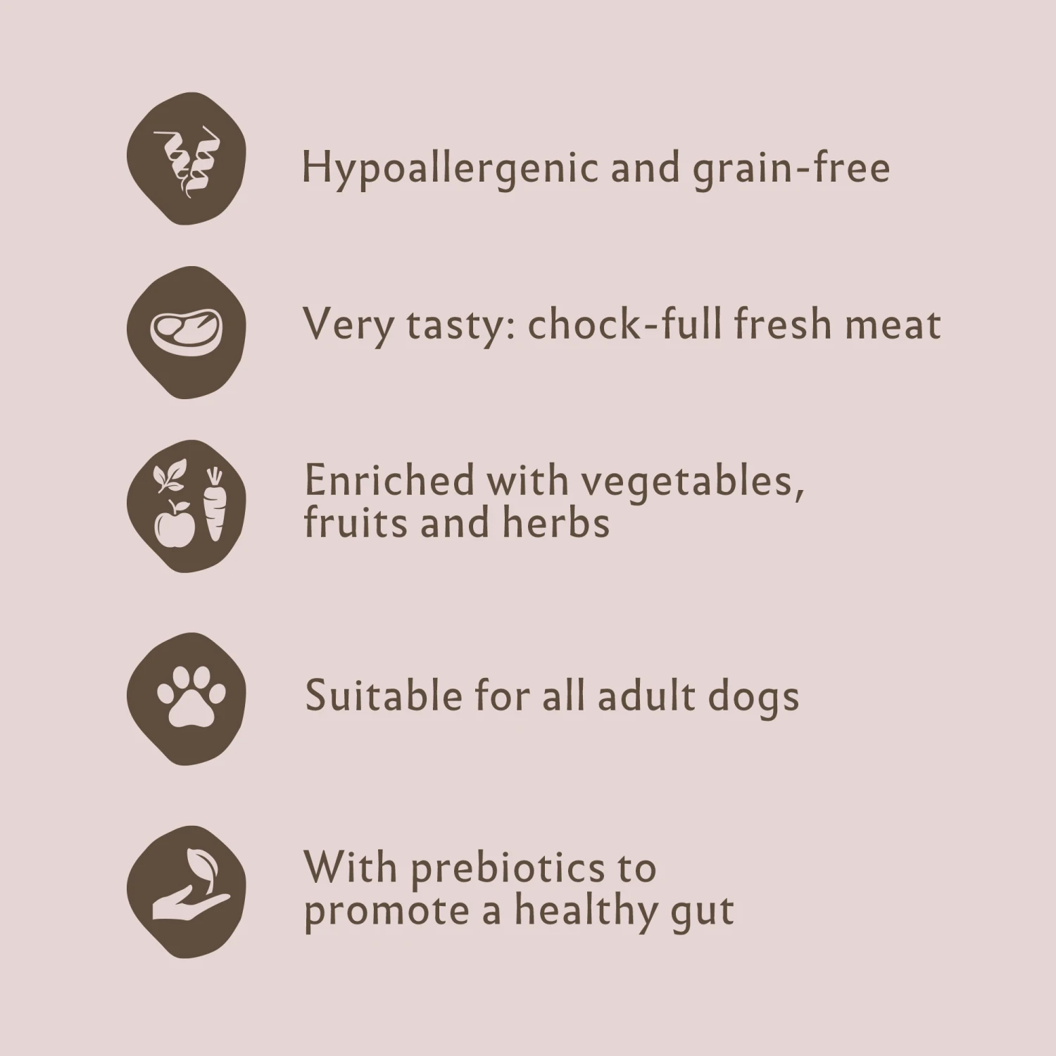 - Lamb: lamb meat 56% (fresh lamb: 20%), potato, peas, animal fat, apple, salmon oil, sugar beet, carrots, brewer’s yeast, flax seeds, vitamins and minerals, ginger, rosa canina, cinnamon, mint, rosemary, Yucca schidigera, glucosamine sulphate, chondroitin sulphate.