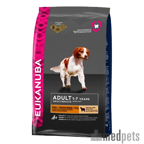 Eukanuba Dog Adult Small & Medium Breed is a dog food for small and medium-sized dogs (< 25 kg) aged 1 to 7. This food is mainly suitable for dogs with a sensitive stomach and skin. This dog food has a stimulating effect on your dog’s digestive system. What’s more, the minerals in this food prevent substances that can form tartar from attaching themselves to the teeth. This dog food also contributes to a healthy skin and a glossy coat. The dog food is available in 2.5 kg bags.