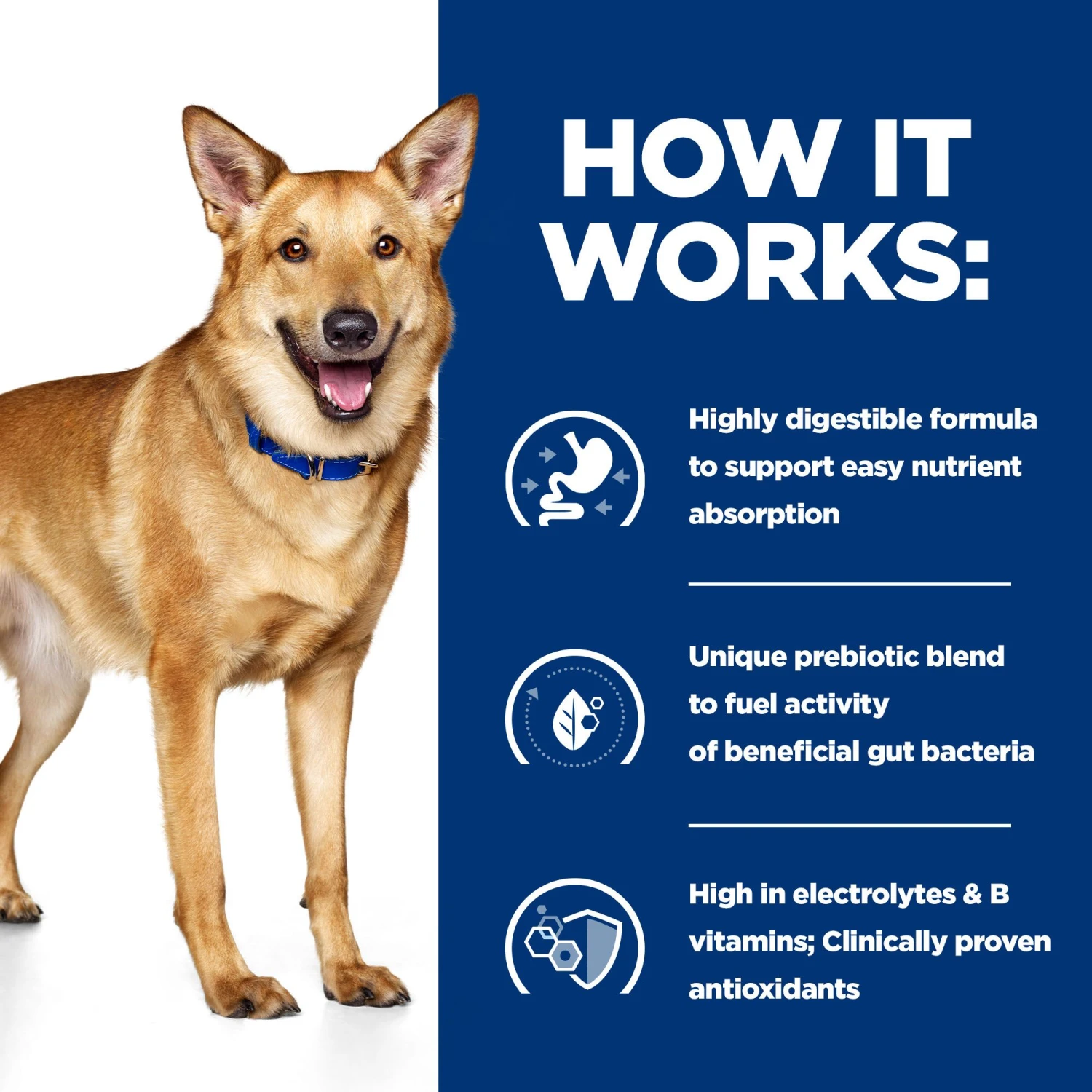 Hill’s Prescription Diet i/d is a complete, balanced food for growing puppies as well as adult dogs. It is highly digestible and ensures the availability of nutrients. The non-irritating texture and reduced-fat content limit vomiting, and gut flora recovers faster due to increased levels of soluble fibre. An increased amount of Vitamin B complex replaces losses caused by vomiting and diarrhoea. Hill’s Prescription Diet i/d also contains a superior antioxidant formula that reduces oxidative cell damage.