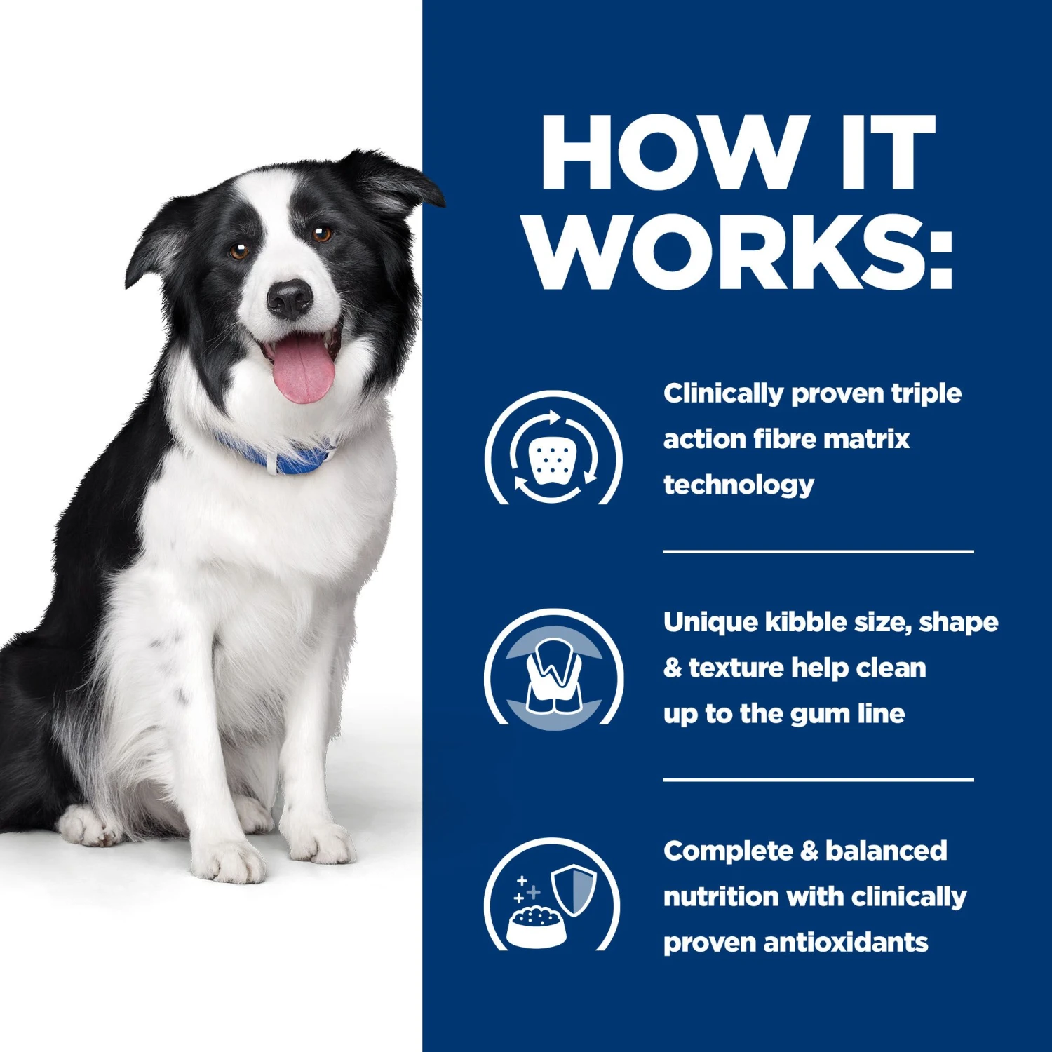 Hill’s t/d provides strong teeth and fights bad breath. The dry food contains no mineral abrasives or active chemicals. They are most effective when given after a professional dental treatment. Other dental care methods are recommended (such as brushing). The dry food of Canine t/d is specially formulated and contains aligned fibres in a special fibre matrix, so the food has to be ground by the teeth. This has a light scraping effect, slowing the development of tartar, plaque and stains. Moderately reduced levels of protein, calcium, phosphorous, and sodium limit the build-up of dental plaque. Hill’s t/d mini contains smaller kibble for dogs weighing less than 10 kg.