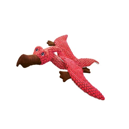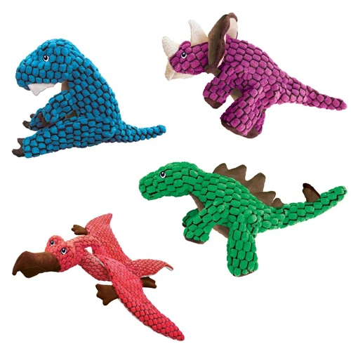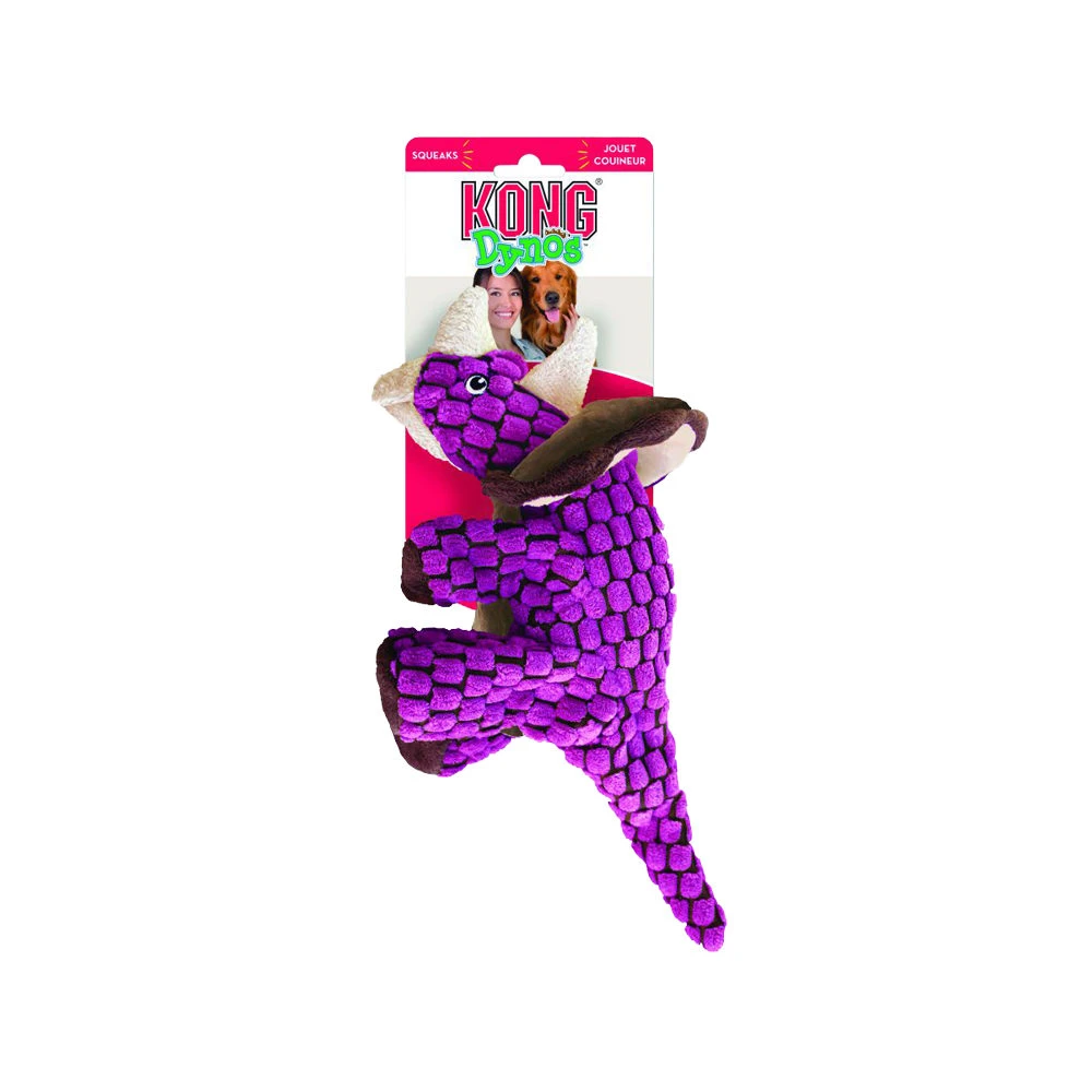 Playing is good for your dog! It keeps him active and challenges him. The KONG Dynos Dynos are colourful and snuggly toys for dogs. The toys have the shape of a T-Rex, Stegosaurus, Triceratops, or Pterodactyl and have different textures, which makes them ever more interesting. The lining is made from extra strong material for longer fun. The added squeak and crinkle sounds make the toy irresistible.
