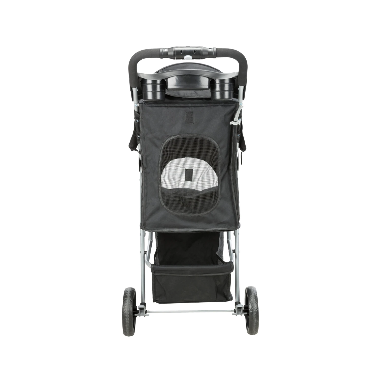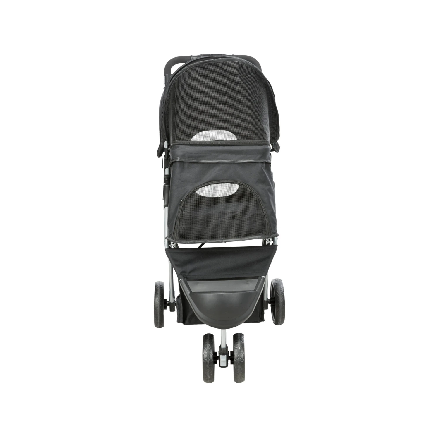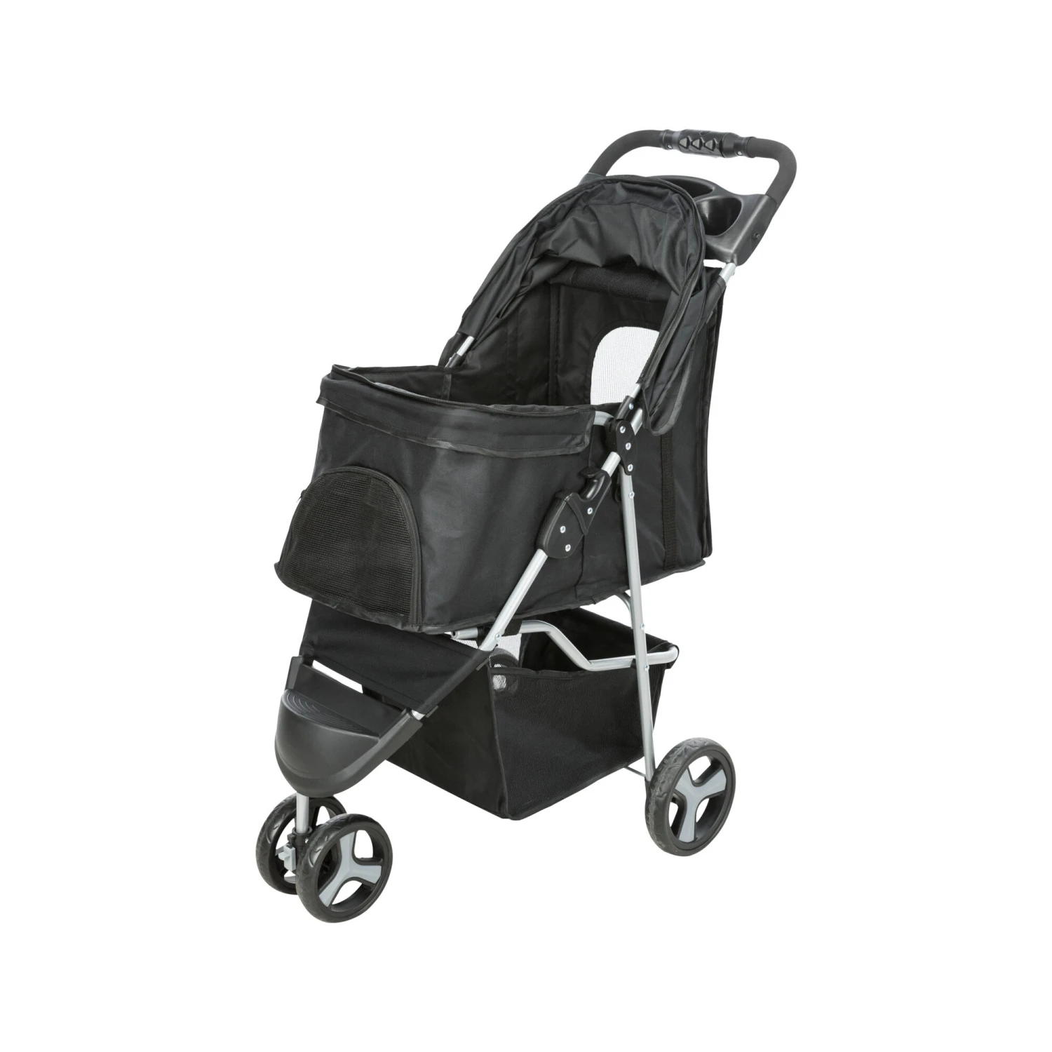 This easily foldable buggy from Trixie allows you to bring your dog or cat everywhere! It is easy to control and has 2 parking breaks. The buggy can be partially or completely closed with the zippers. The buggy comes with a 360-degree rotatable wheelset, making it extremely easy to maneuver. The handle is padded and has storage compartments and a basket for optimal use. Finally, the buggy has a large tailgate, which makes getting in and out very easy for dogs and cats!